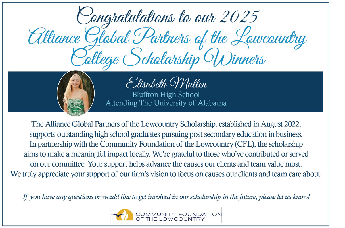 The Alliance Global Partners of the Lowcountry Scholarship, which was established in 2022, provides post-secondary scholarship opportunities for qualified students scheduled to graduate from a high school located in southern Beaufort County, with plans to pursue a post-secondary education in the area of business through an accredited college or university.